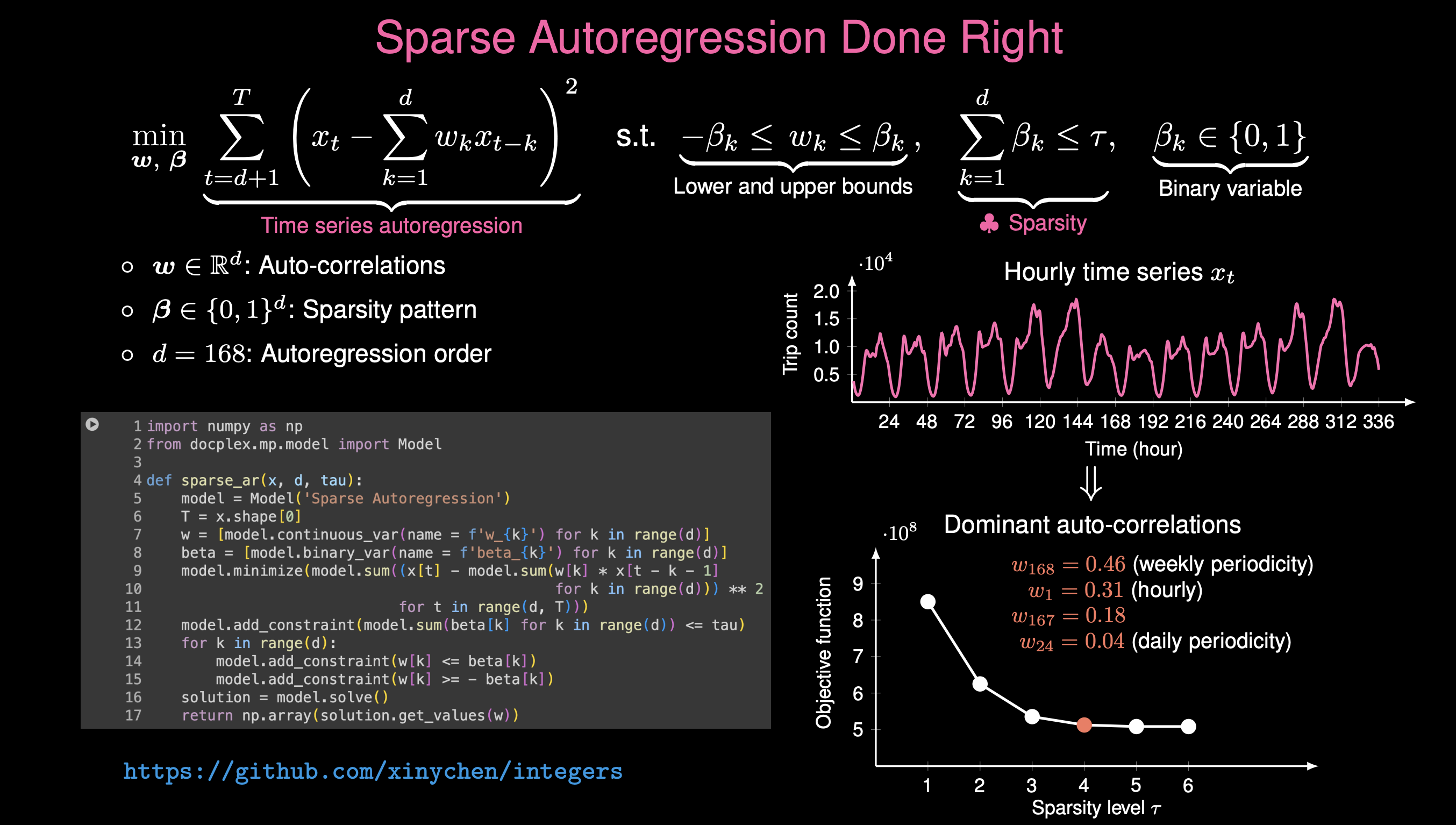 🔨 Identification of the dominant auto-correlations from time series through sparse autoregression. The sparsity constraint allows one to find the dominant auto-correlated time lags (e.g., $k=1,24,167,168$).